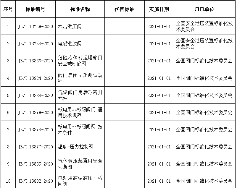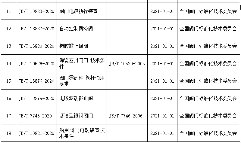 根据中华人民共和国工业和信息化部公告2020年第15号,工业和信息化部批准公布了一批行业标准,其中由全国阀门标准化技术委员会和全国安全泄压装置标准化技术委员会归口的标准共18项,现予以公布,如下表: